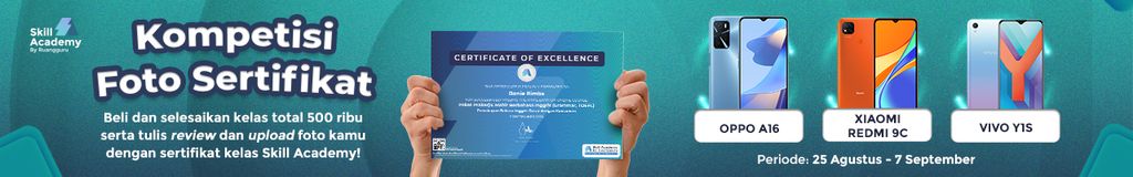 Terima kasih telah mengikuti kelas-kelas pada Platform Skill Academy. Mohon luangkan waktu Anda untuk membaca keseluruhan Syarat dan Ketentuan Khusus Kompetisi Foto Sertifikat Skill Academy (“Syarat dan Ketentuan Khusus”) ini. Syarat dan Ketentuan Khusus ini merupakan satu kesatuan dan bagian yang tidak terpisahkan dari Syarat dan Ketentuan Umum Penggunaan Platform yang dapat diakses di https://skillacademy.com/legal/terms-and-conditions (“Syarat dan Ketentuan Umum”) dan Kebijakan Privasi yang dapat diakses di https://skillacademy.com/legal/privacy-policy (“Kebijakan Privasi”). Dengan melakukan pembelian kelas Skill Academy, Anda akan dianggap telah membaca, memahami dan menyetujui Syarat dan Ketentuan Khusus ini.